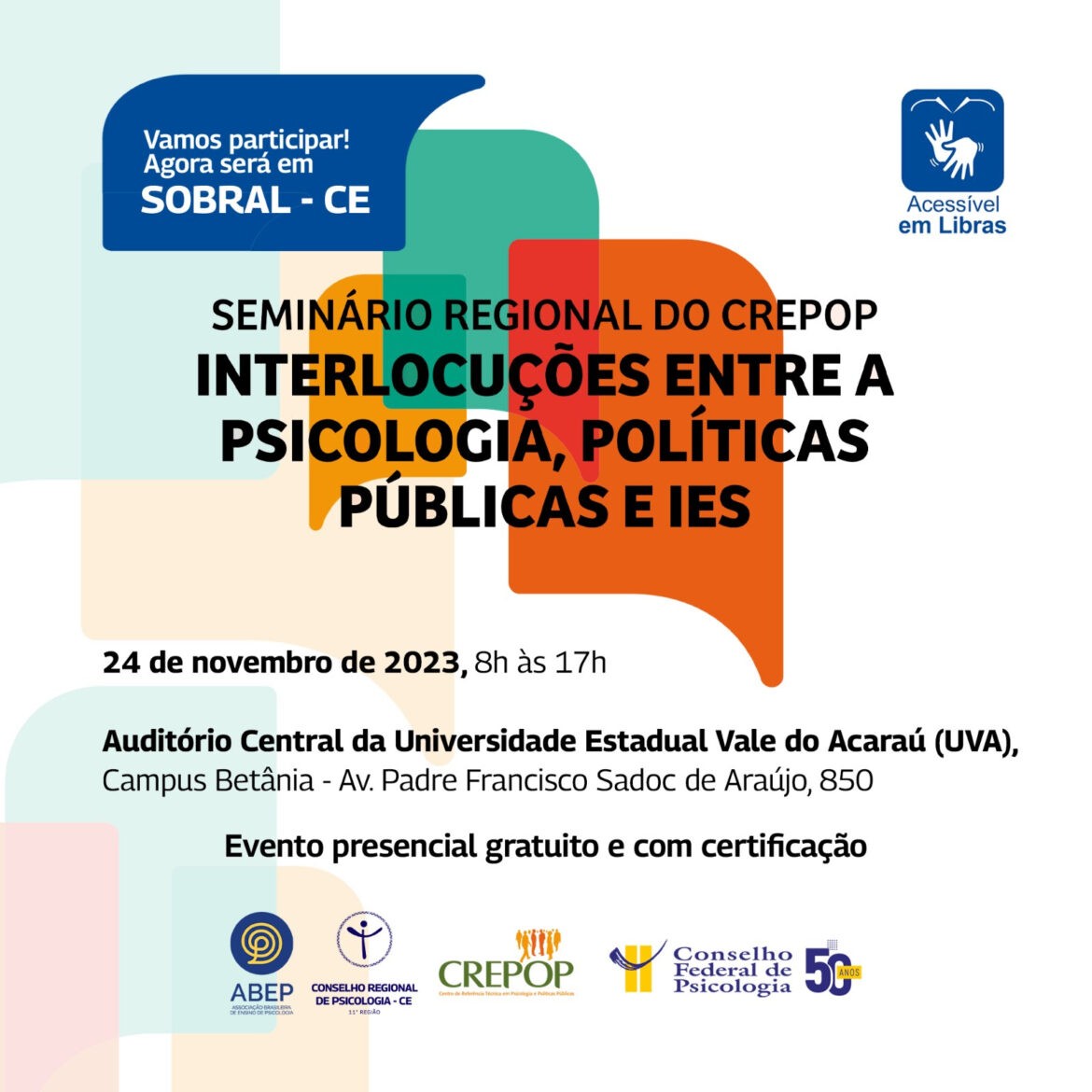 No dia 24 de novembro o Conselho Regional de Psicologia 11ª Região realizará o Seminário Regional da CREPOP (Centro de Referências Técnicas em Psicologia e Políticas Públicas), visando propagar o diálogo entre a Psicologia, as Políticas Públicas e as Instituições de Ensino Superior (IES). O evento, que iniciará às 8h e encerrará às 17h, acontecerá no Auditório Central da Universidade Estadual Vale do Acaraú (UVA) no Campus Betânia em Sobral. O evento é gratuito, com inscrições limitadas.