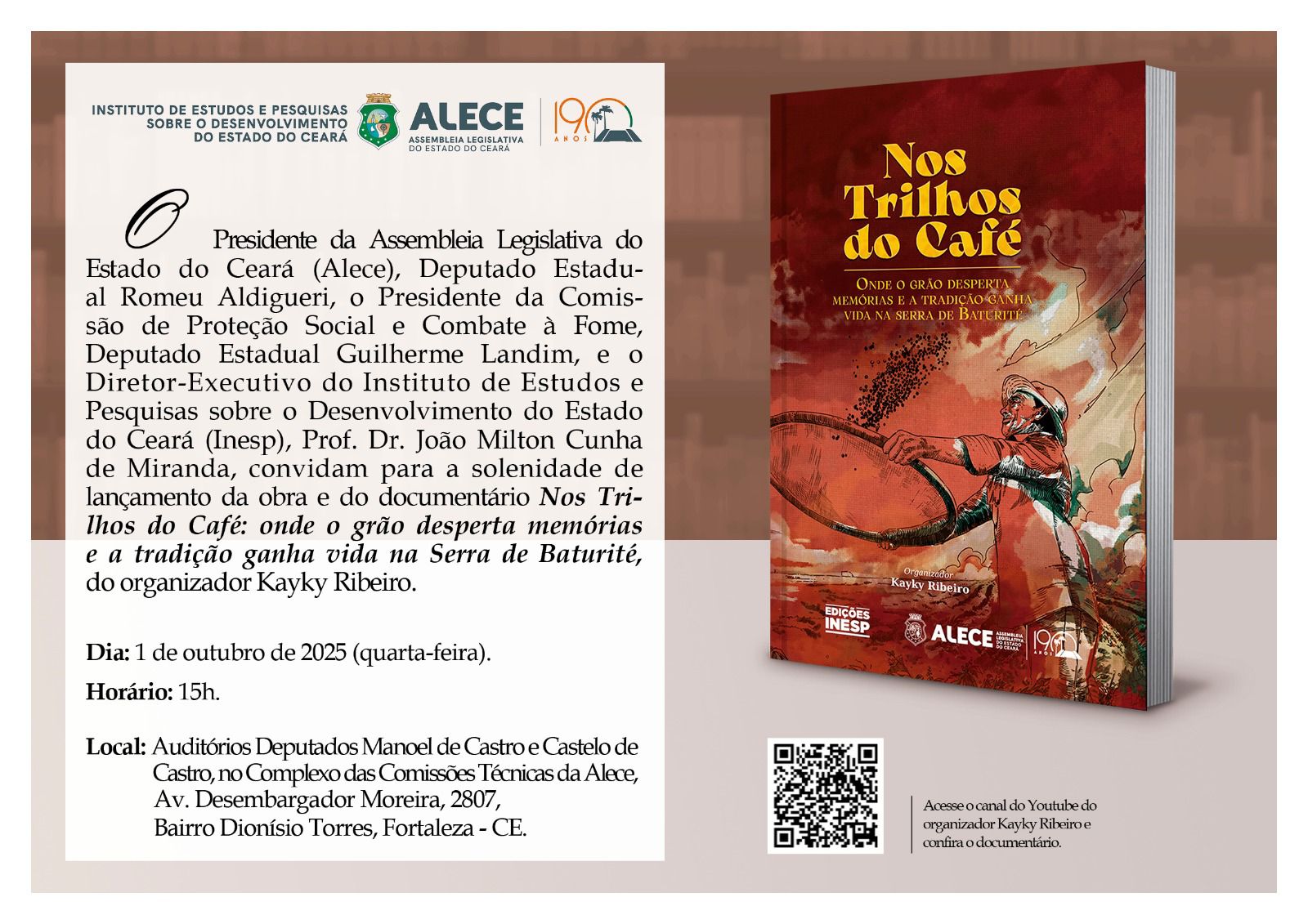 A Assembleia Legislativa do Estado do Ceará (Alece), por meio do Instituto de Estudos e Pesquisas sobre o Desenvolvimento do Estado do Ceará (Inesp), promove, no dia 1º de outubro de 2025 (quarta-feira), às 15h, o lançamento da obra e do documentário Nos Trilhos do Café: onde o grão desperta memórias e a tradição ganha vida na Serra de Baturité.